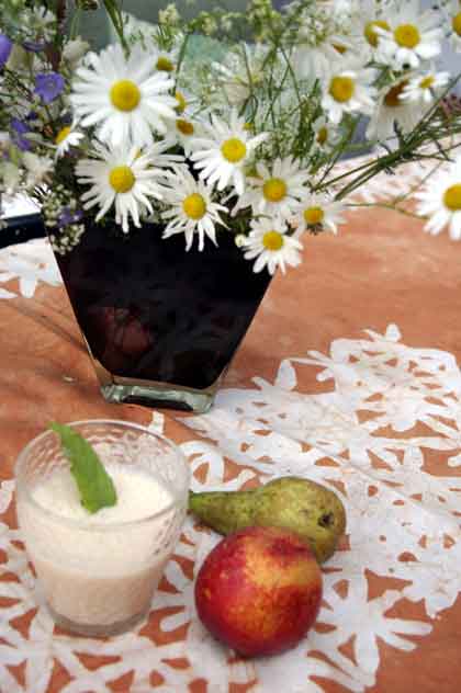 Anna pitää makeasta. Jussi pyöräytti uudella tehosekottimellamme tuorepirtelöt päärynöistä, nektariineista ja punaherukkahillosta ananasmehun ja maidon kera. Samu sanoi nam-nam ja joi toisenkin mukillisen.