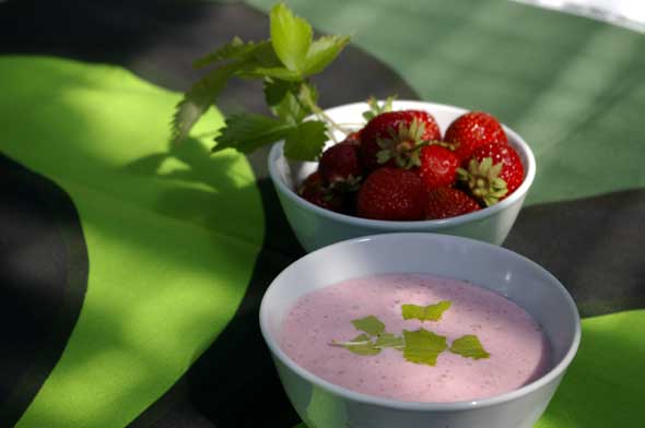 Koska mansikka-aika on parhaimmillaan, laitoimme yhdessä viiden kilon laatikollisen punaisia marjoja pakastimeen. Jussi pyöräytti kookosmaidon kera tuoreista mansikoista pirtelöt päiväkahvin kera. Seuraavaksi kokeilemme mustikoita, jotka ovat saaneet jo lupaavasti väriä.