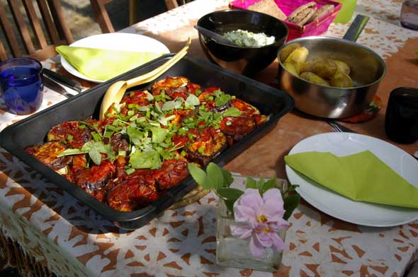 Toinen herkku, jolla yllätän mielelläni vieraat, on vahva munakoisopata. Nyt tarjosin sen uusien perunoiden ja kaalisalaatin kera.