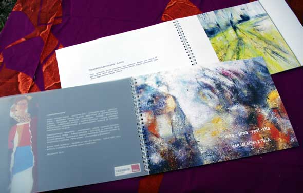 Portfolion teko ei ollut mikään pikkujuttu. Tekstiä piti olla vähintään viisi A4 sivua. Siinä piti pohtia lopputyöprosessia. Minulle tehtävä oli mieluinen, sillä kirjoittelen mielelläni. Maarit tarkasti kirjoitelman ja antoi palautetta: ”Mielenkiintoinen teksti, ei korjattavaa”. Kirjaseen tuli lopulta 48 sivua ja runsaasti kuvia. Suurin työ oli keksiä kuville nimet. Lueskelin maalaamisen ohessa runokirjoja ja liitin kuvateksteihin pieniä säkeitä.