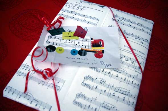 Otso, lapsenlapsistani vanhin, täytti tänään Leenanpäivänä kolme vuotta. Heräsin aamuvarhaisella askartelemaan hänelle syntymäpäiväkorttia. Poikalapsi innostuu aina nähdessään isoja autoja. Niinpä aiheenvalinta oli helppo. Koska mökiltä ei löytynyt lahjapaperia, käärin paketin laulutervehdyksen muotoon.