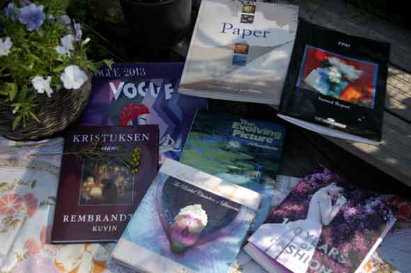 Taidekirjoja selailen jatkuvasti. Kiitos siitä taidehistoria- ja taidekouluopintojen. En juurikaan osta enää kirjoja – onhan erinomaiset kirjastot käytettävissä. Kun opiskeluaikana kirjoittelin tutkielmia ja tein proseminaarityötä, minun ei tarvinnut muuta kuin kertoa aihe henkilökohtaiselle kirjastovirkailijaystävälleni Liille. Tavatessamme hänellä oli kassikaupalla kirjallisuutta minun käyttööni. Viimeksi sain kirjastotuliaisena kuvankauniin kukkakirjan, joka oli poistolistalla. ”Tässä sinulle kollaasimateriaalia”, Lii lupasi. Mutta enhän minä kirjoja revi, sen verran kunnioitan poistokirjakin.