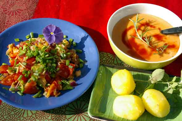 Päiväruoka oli oma lukunsa. Jos minulla ei olisi ruokablogia, söisin suoraan jääkaapista mitä löytyy. Mutta kun intohimona on ottaa maukkaita ruokakuvia, siinä saa itsekin kauniisti katettuja aterioita. Kaapista löytyi uusia perunoita, juustomausteista ruokakermaa, tomaatteja ja varhaiskaalia. Kehittelin niistä maistuvan lounaan pihamaan yrttien kera.