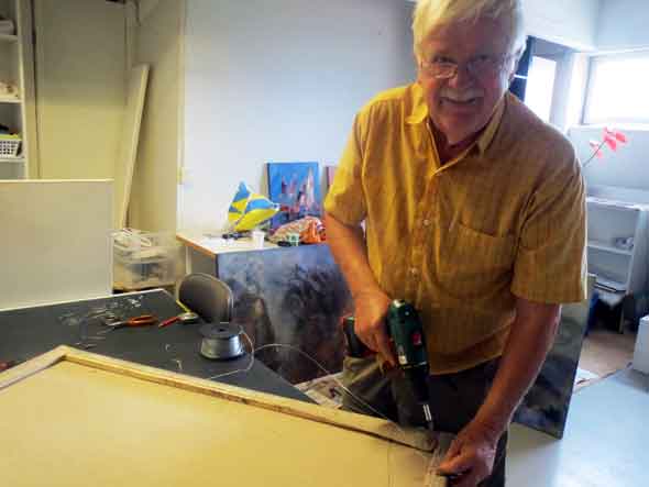 Vietimme helteisen sunnuntaiaamupäivän 10.8. työhuoneellani. Jussi kiinnitti loppunäyttelytöihin ripustuslangat. Minä otin maalaukset sitä mukaa viimeistelyyn. Se tarkoitti reunojen maalaamista. Miten ollakaan, siniharmaa sävy sopi lähes kaikkiin. Vain siskon varaama työ – Punaiset purjeet (joka ei ollut tulossakaan tähän näyttelyyn) – sai punaista myös reunoille.