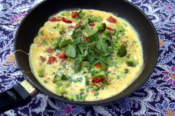 Munakas syntyi kolmesta kananmunasta, parsakaalinnupuista, tomaatinlohkoista ja ohueksi leikatusta purjosta. Maustoin suolalla, pippurilla, kuivatulla oreganolla ja sipulinvarsilla. Lopuksi koristelin koko komeuden rucolan lehdillä.