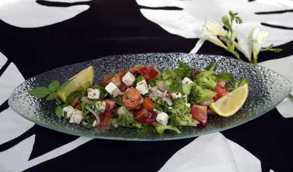 Mökkisalaatti syntyy siten, että katsotaan mitä kaapeista ja yrttimaalta löytyy. Tässä versiossa on kiehautettuja parsakaalinnuppuja, porkkananviipaleita, tomaatteja, salaattijuustoa, salottisipulia sekä tuoreyrttejä ja rucolaa. Maustoin sitruunalla, tilkalla oliiviöljyä sekä pippurilla.