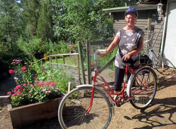 Aikaa runsaan 20 km:n matkaan kului taukoineen hulppeat kolme tuntia. Minun vanhassa pyörässäni ei ole vaihteita eikä Jussinkaan pyörä ollut huippukunnossa. Se ei haitannut, sillä kiirettä ei ollut. Kotona emme voineet palkita itseämme pizzalla kevytruokaviikon vuoksi. Nautimme sen sijaan suihkusta, karjalanpiirakoista ja iltateestä. Ja tunsimme itsemme hyviksi ihmisiksi.
