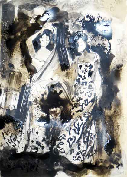 Kesätauon jälkeen oli ilo palata litografian pariin. Kokeilin rasvaliitujen lisäksi tussia kuvan maalaamiseen. Nyt jännittää, miten tussijälki toistuu vedostettaessa. Näen lopputuloksen toivottavasti pian, sillä jatkamme graafikkosiskojen kanssa työskentelyä kerran viikossa Arx-talon taideluokassa.