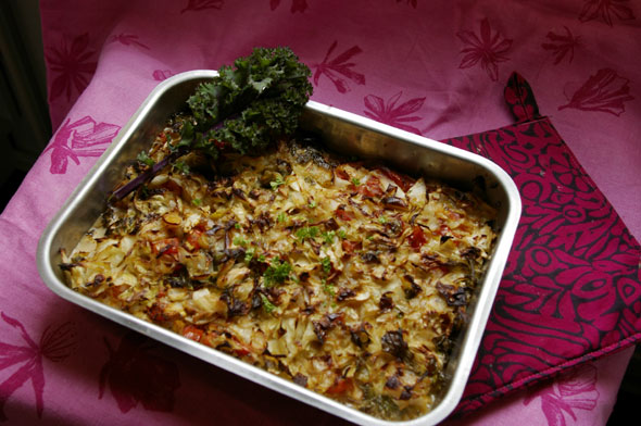 Kuullotin toisella pannulla keltasipulia, purjosipulia, herkkutatteja ja tomaattikuutioita. Maustoin tilkalla juustoista ruokakermaa ja lisäsin yrttisuolaa, pippuria ja kuivattua oreganoa. Ladoin ainekset uunivuokaan, lorautin päälle reippaasti siirappia ja paistoin tunnin verran 200 asteessa. Tarjosin laatikon runsaan puolukkahillon kera. Jos haluaa tehdä tukevamman version, kaalin sekaan voi sekottaa kypsää riisiä tai ohraa.