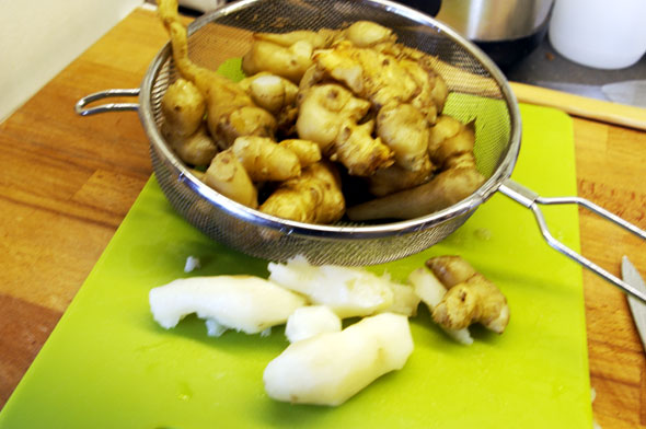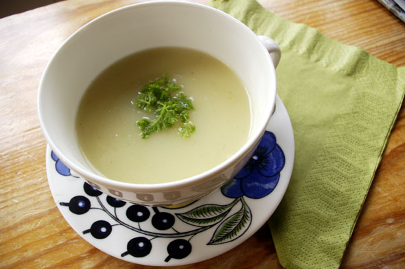 Kiehatin pestyt juurimukulat vedessä. Kuorimme muhkurat yhdessä Lauran kanssa. Laitoin pilkotut sokat kiehumaan yhdessä perunakuutioiden ja hienonnetun keltasipulin kera kasvisliemikuutiolla maustettuun veteen. Hetkessä aromaattinen tuoksu täytti keittiön. Soseutin keiton ja lisäsin pinnalle tuoretta persiljaa. Annos oli aivan Master Chef-tasoa.