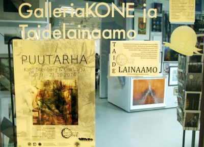 Hämeenlinnalainen taiteilijapariskunta Katri Stenberg ja Olli Larjo ovat ripustaneet riemastuttavan näyttelyn 50-vuotispäiviensä kunniaksi Galleria Koneeseen. Me kirjoittajat kiertelimme Ollin jättikokoisten puuveistosten keskellä. Pientareen kukat innoittivat kirjoittamaan tarinoita otsikolla ”Seppele”.