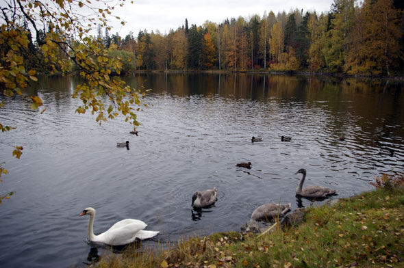 Teimme reippaan retken lähimaastoon eli Aulangolle. Syysvärit hehkuivat keltaisina ja oranssinpunaisina. Joutsenlampi on minulle tuttu jo lapsuudesta. Oli hauska seurata joutsenperheen tyylikästä lipumista tyynellä lammella.