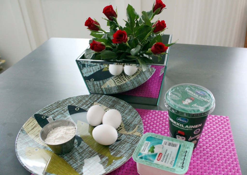 Näin ne tein. Valutin purkillisen maitorahkaa ja turkkilaista jogurttia kahvinsuodattimessa puolisen tuntia. Rikoin kulhoon kolme kananmunaa, sekoitin ne ja lisäsin rahka-jogurttiseoksen, ruokalusikallisen sokeria, ripauksen vaniljasokeria ja toisen ripauksen suolaa. Lopuksi lisäsin desilitran vehnäjauhoja ja sekoitin tasaiseksi.