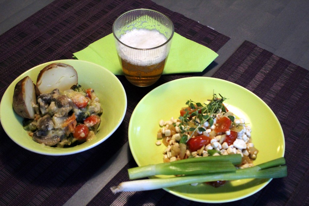 Kiehautin lisukkeeksi paloitellut parsakaalin varret. Tein valkokastikkeen ja käytin nesteeksi parsakaalin keitinliemen ja ylellisesti kuohukermaa. Kuullotin pannulla pieniä herkkusieniä, kirsikkatomaatteja ja silputtua sipulia. Lisäsin kaikki kastikkeen joukkoon ja maustoin yrttisuolalla ja mustapippurilla. Laitoin annoksen uunivuokaan ja sekoitin siihen raa’at parsakaalin nuput. Raastoin päälle vahvaa parmesanjuustoa. Gratinoin kuumassa uunissa kymmenisen minuuttia. Tarjosin annoksen uuniperunoiden sekä tuoreen timjamin kera. Maku oli kohdallaan.