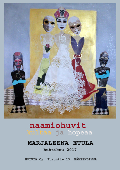 Hoiviaan ripustan ”Naisen naamio” -näyttelystä tuttuja kollaaseja. Siellä on huhtikuussa taideviikko, jonka teemana on kollaasit. Minun työni toimivat inspiraationa koko viikon kestäville työpajoille.