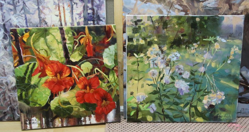 Sain valmiiksi kaksi kukkamaalausta. Kokoa niillä on 50 x 50 cm. Meillä on Mari -taiteilijaystävän kanssa näyttely helmikuussa 2018 Jorvin sairaalassa. Kukkateemalla. ”Hyvä teema”, sanoi graafikkosisko Kukka.