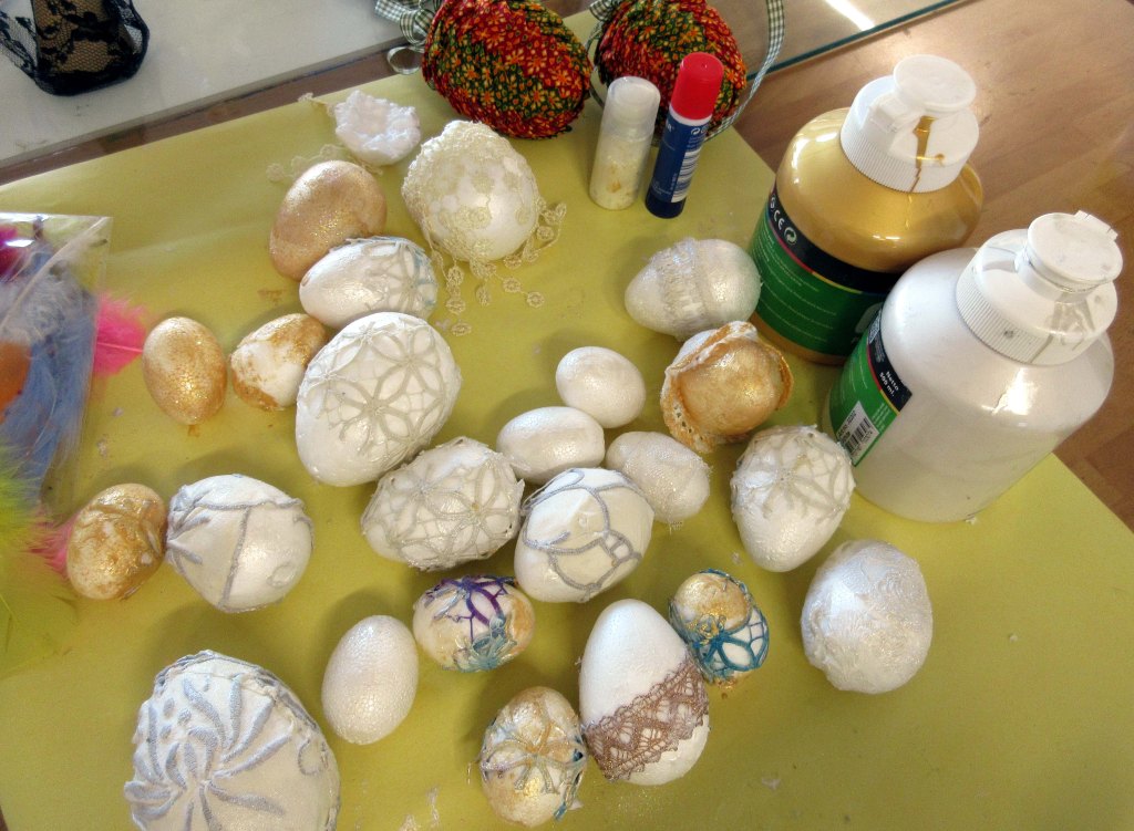 Ostin myös muutaman styroksmunan. Liimasin pitsinpalasia pintaan ja viimeistelin kulta- ja hopeamaalilla. Nykyään löytyy perinteisen muovailuvahan lisäksi kiinnostavia siistejä askartelumassoja.