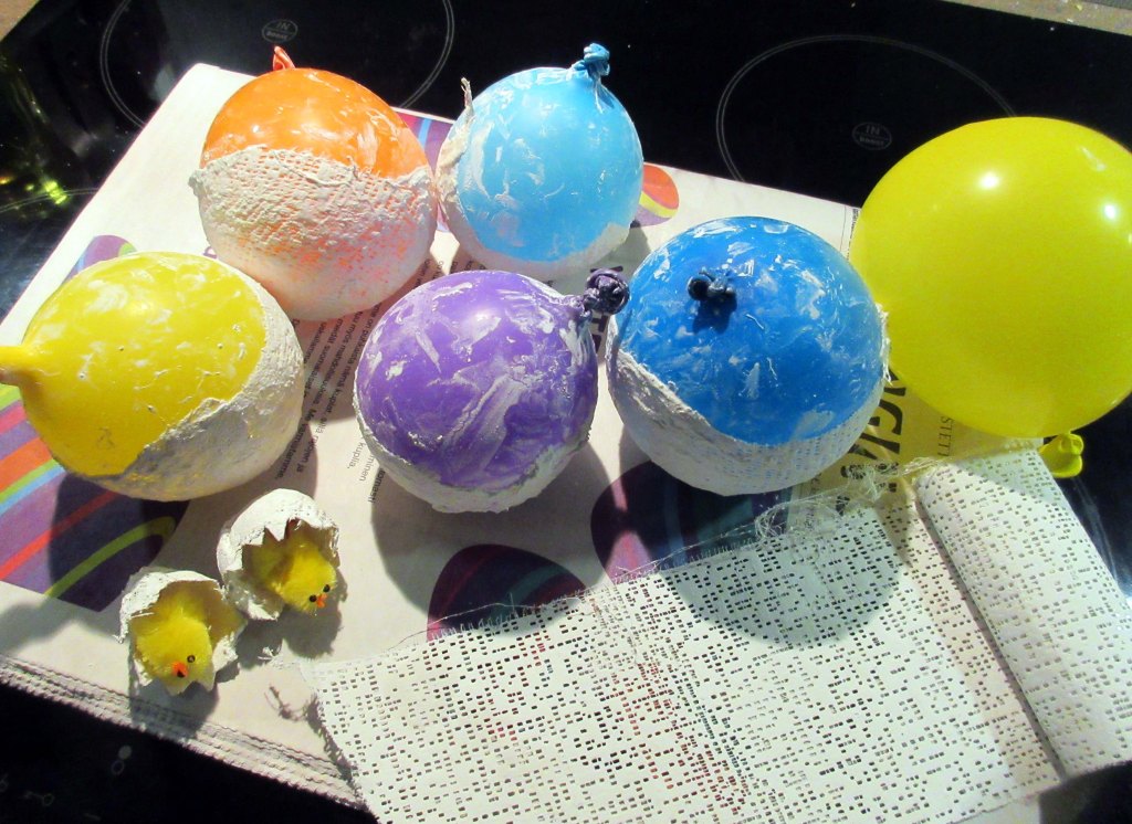 Hulvattomin idea oli hankkia valmista kipsinauhaa, jota oikeasti käytetään kipsisidoksissa. Sitä voi kosteana muotoilla ilmapallon päälle. Kun kipsi on kuivunut, ilmapallo puhkaistaan ja kas, saksilla muotoilemalla saa oivan munankuoren puolikkaan.