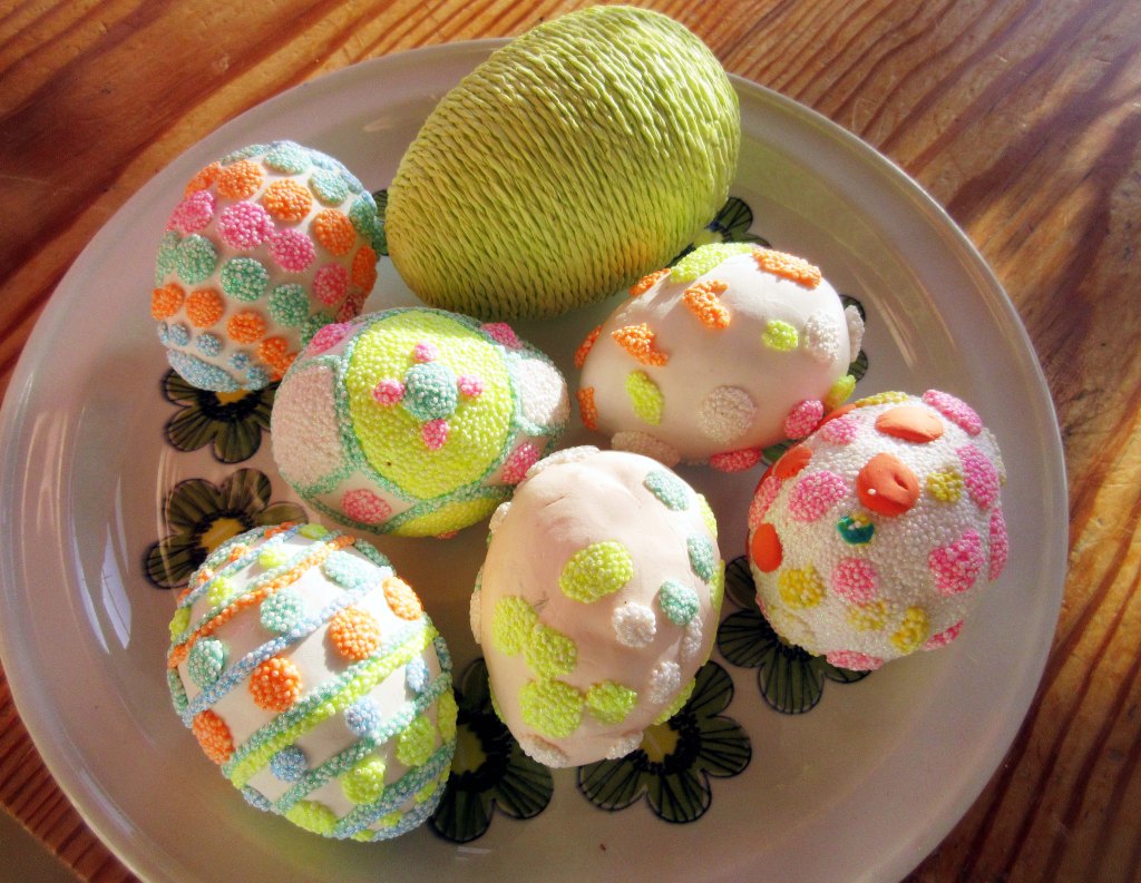 Olen ihastunut Silk Clay muovailumassaan, joka kovettuu itsestään. Sitäkin voi hyödyntää pääsiäiaskartelussa ja muotoilla erikokoisia ja erivärisiä pääsiäismunia. Kuvan munat ovat styroxia ja ne on päällystetty muovailumassalla. Puuvillanarulla päällystetty muna on Lauran taidonnäyte.