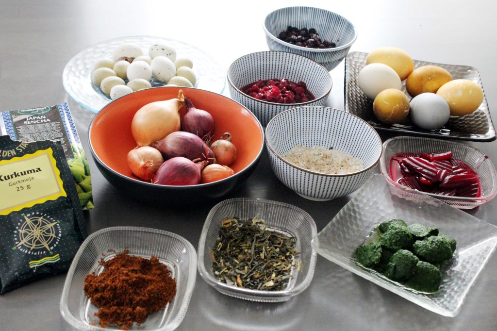Pääsiäinen ja pääsiäisaskartelu Tuomelan marttojen kanssa lähestyy. Innostuin kokeilemaan eri väriaineita. Olen tähän asti tyytynyt sipulinkuoriin ja mustikoihin. Netistä löytyi tietoa, jota sovelsin kotoa löytyvien aineiden mukaan.