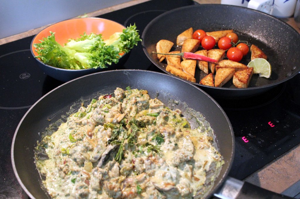 Käytin lisukkeena tofua, herkkusieniä ja pinaattia sekä lempimakujani salotti- ja valkosipulia, chiliä, purjoa, tuoretta inkivääriä ja soijakastiketta sekä limeä ja korianteria. Kookoskerma pehmensi vahvat mausteet. Lopputulos oli maistuvainen.