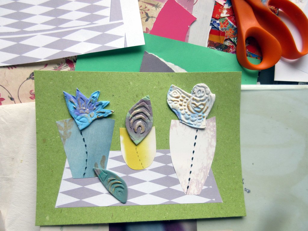 Massasta syntyi sekä kukkia että kukkamaljakoita. Liimasin ne korttipohjille ja jatkoin sommittelua kollaasitekniikalla. Tämä oli taas kerran uusi aluevaltaus. Mihin vielä ehdinkään, jos/kun intoa riittää!