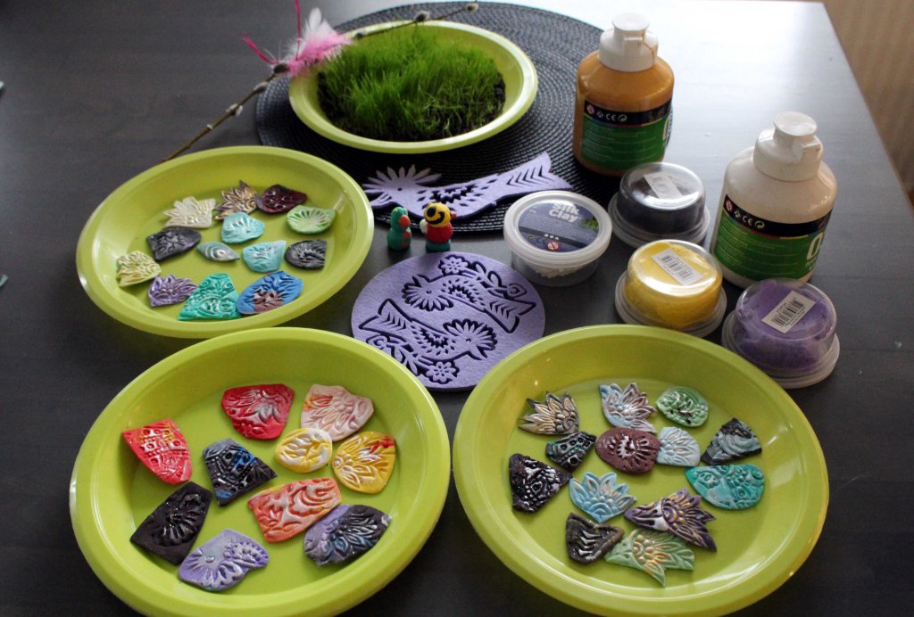 Kokeilin, voisiko muovailumassaa hyödyntää pääsiäiskorteissa. Toden totta, kaikkeahan voi. Kaulitsin massan ohueksi levyksi ja painoin siihen muotilla kuvioita. Sivelin vielä pintaan hopeista akryyliväriä. Muotoilu sujui näppärästi saksilla.