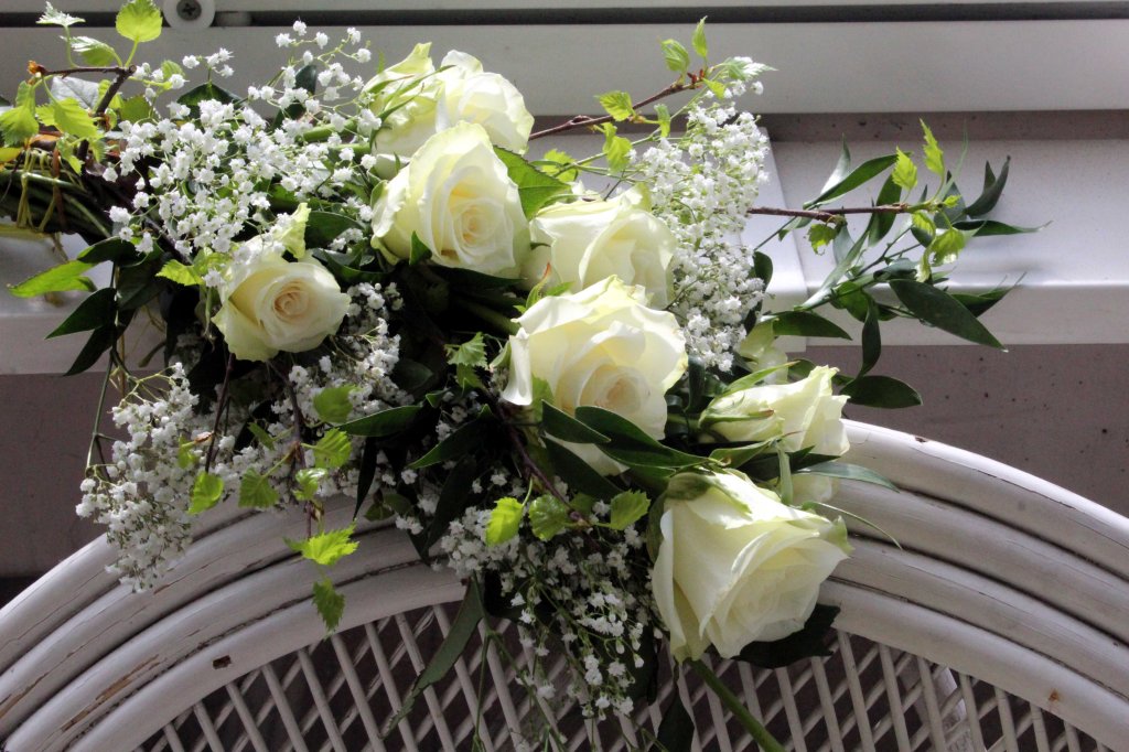 No ei sentään. Mutta kukista pidän. Livenä ja maalausmalleina. Halusin sitoa itse kimpun huomisiin hautajaisiin. Ostin Hämeenlinnan torilta 20 valkoista ruusua, harsokukkia ja vihreitä oksia. Sommittelin kimpun taipuisaksi ja sidoin niinellä. Lopputulos oli siro ja käsintehdyn näköinen.