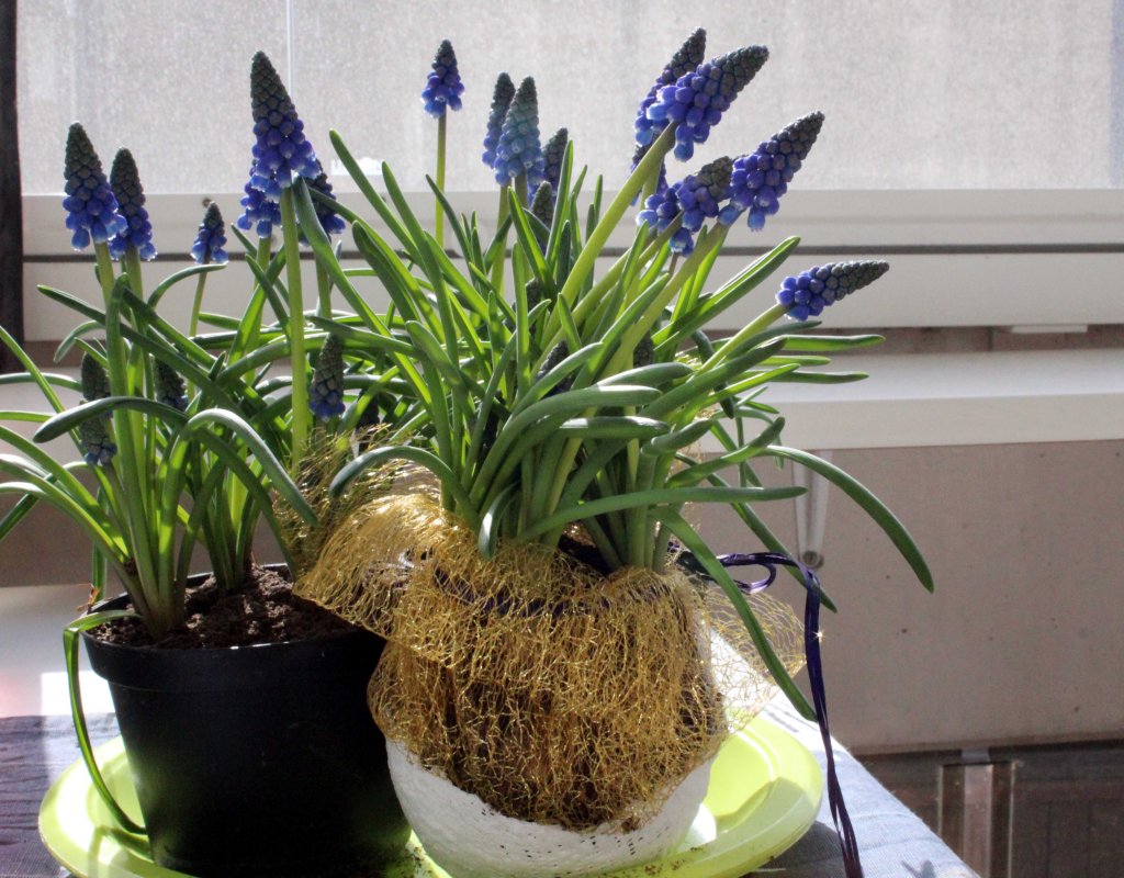 Ostin torilta myös heleitä keväisiä helmililjoja. Istutin ruukullisen muotoilemaani munankuoreen ja sidoin kultaista verkkoa koristeeksi.