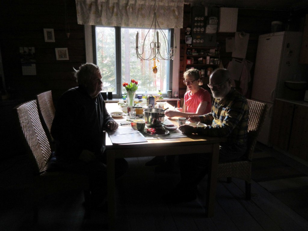 Nautimme alkupalaksi Tertun värikästä pääsiäiskakkua kahvin kera. Saunapuhtaina istahdimme viettämään iltaa lämpimässä tuvassa. Immo oli keitellyt maistuvaisen tuoreparsakeiton. Valkosipuli-yrttituorejuusto antoi sille pikantin maun. Saimme myös uunituoreita sämpylöitä ja poronpaistia. Terttu ja Immo olivat palanneet hiljattain hiihtomatkalta Posiolta. Siksi poroa.