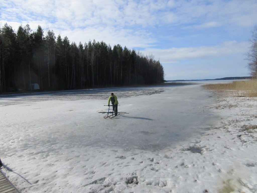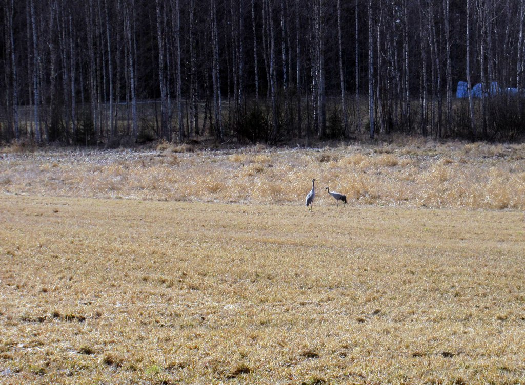 Miehet viihtyivät rannalla. Minä lähdin Tertun kanssa pajunkissaretkelle. Löysimme ensimmäiset sinivuokot ja näimme läheisellä pellolla kaksi komeaa kurkea.