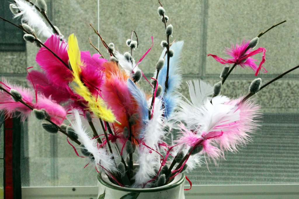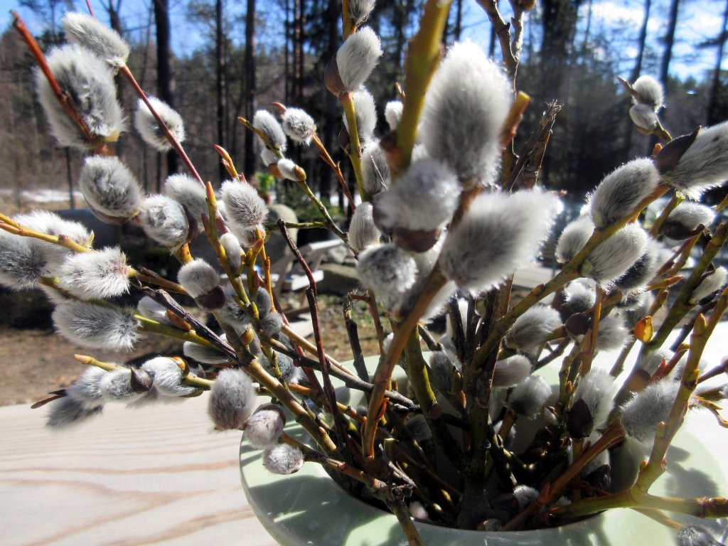 En ole vielä tähän ikään mennessä sitonut itse virpomisvitsoja. En ole nytkään menossa virpomaan, mutta Kuhmoisista kerätyt pajunkissat saivat höyheniloa.