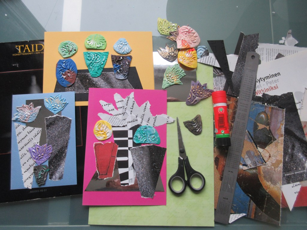 Ilta vierähti mukavasti Silk Clay -askartelumassan parissa. Nyt en muovaillut lumiukkoja enkä enkeleitä enkä pääsiäismunia vaan kukkia ja kukkaruukkuja. Sain näin aivan uuden ilmeen kollaasikortteihini. Ja hauskaa oli.