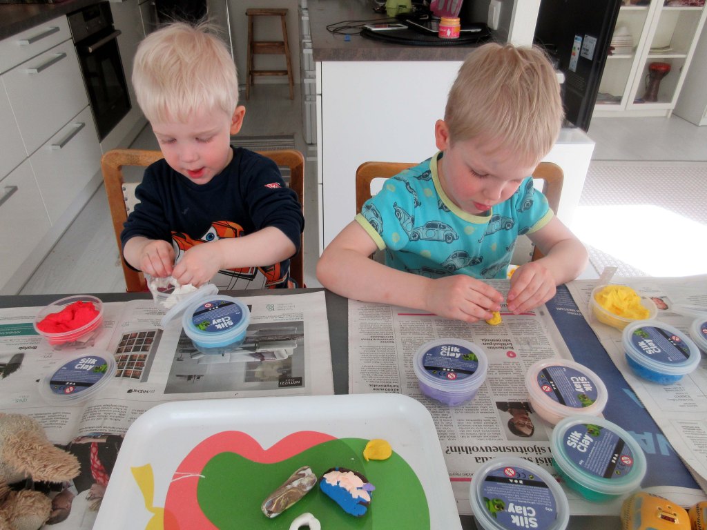 Otso ja Visa innostuivat piirtelemään ja muovailemaan aamupuuron jälkeen.
