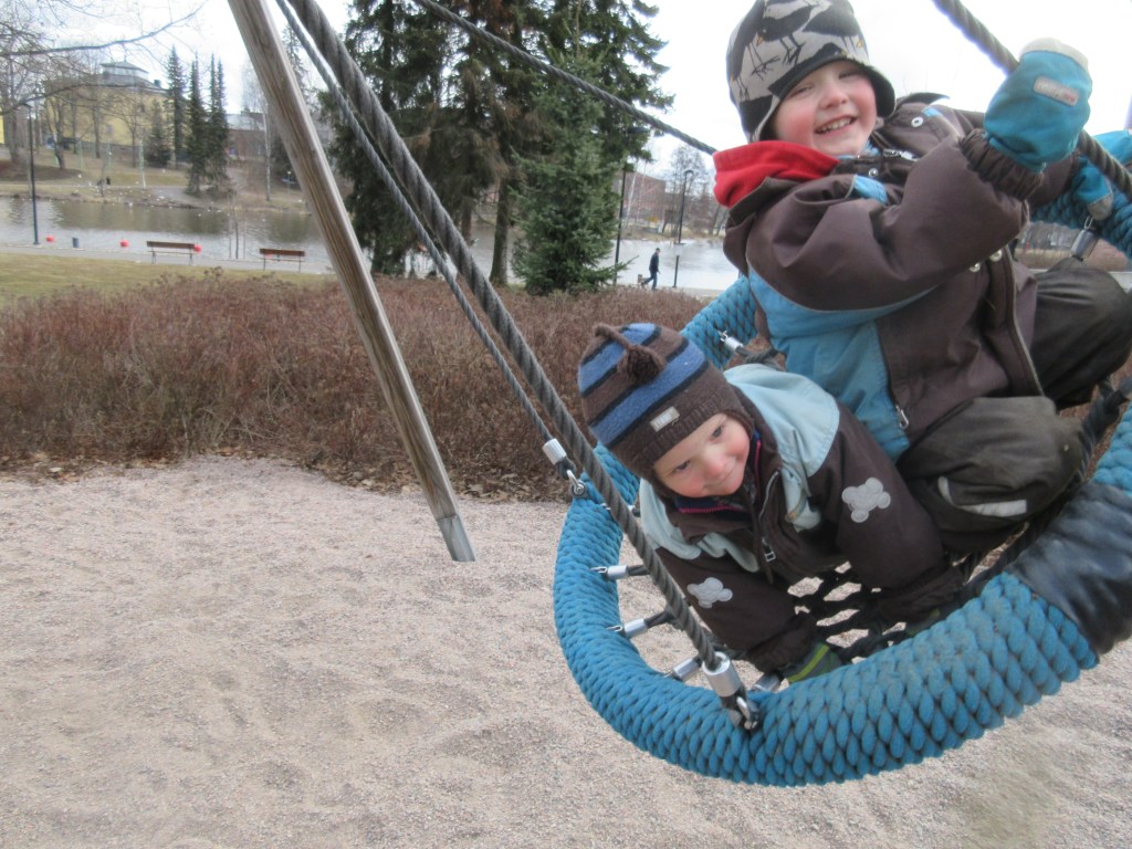 Aamulla lämpömittari oli nollassa. Ilmanala oli todella kolea, kun Anna ja pojat, myös Jussi, lähtivät aamupuuron jälkeen leikkipuistoon.