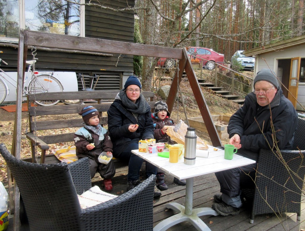 Kaiken raatamisen jälkeen pullakahvit ja pillimehut maistuivat keinulla.