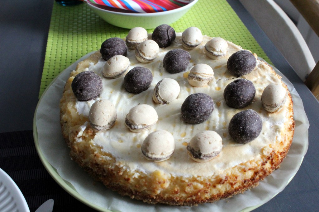 Tukevan lounaan jälkeen maistui kevyt jälkiruoka. Sekin oli Jaana-siskon käsialaa. Raikas sitruunapiirakka pääsiäismunakoristeiden kera oli herkkua. Sisko kiittää.