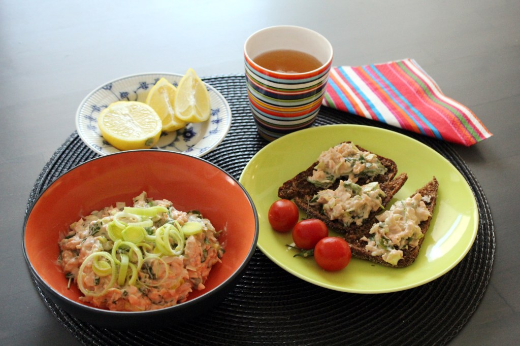 Keksin tehdä lopuista lohitahnaa levitettäväksi paahtoleivän päälle. Tehosekoitin olisi ollut hyvä, mutta käsipelilläkin se onnistui. Painelin haarukalla palat pieniksi, lisäsin hienoksi pilkotun salottisipulin, purjoa renkaina ja kourallisen rucolaa. Maustoin soijakastikkeella, majoneesilla, puristetulla sitruunanmehulla ja rouhitulla pippurilla. Tilkka valkosipuli-chilikastiketta antoi potkua. Jos kaapista olisi löytynyt vielä tuoretta inkivääriä ja tuoretta tilliä, makuelämys olisi ollut täydellinen. Vaan hyvää se oli näinkin paahdettujen ruispalojen ja oluen kera!