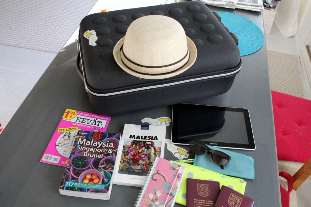 Viime hetken muistilistaa: ”Keskeytä Hesari, palauta kirjaston kirjat, ota Malaysia Lonely Planetista täsmäkopiot, printtaa lento- ja hotellivaraukset, tee Finnairille lähtöselvitys, lähetä Miikalle tiedot passeista ja matkareitistämme, lataa kameroiden ja tabletin akut, varaa Hämeen keskiaikamarkkinoilta torikoju, jätä gallerian avain loman ajaksi pajalle, siivoa työhuone, kokoa akvarellivälineistä matkapakkaus, ota passit esille, muista aurinkolasit ja lentosukat.”