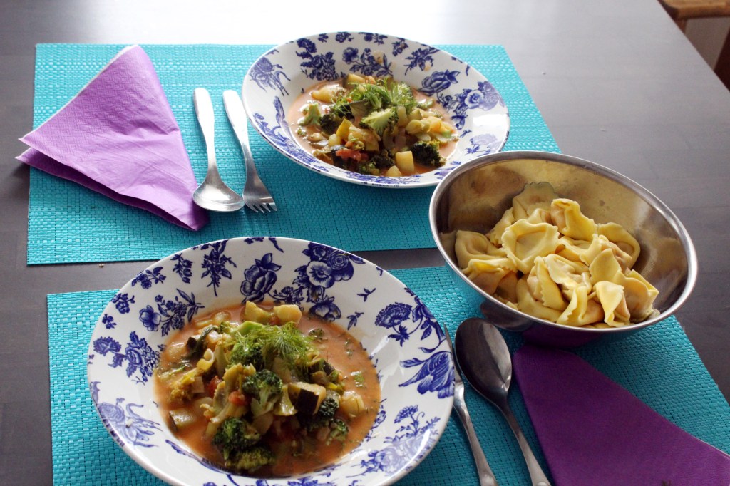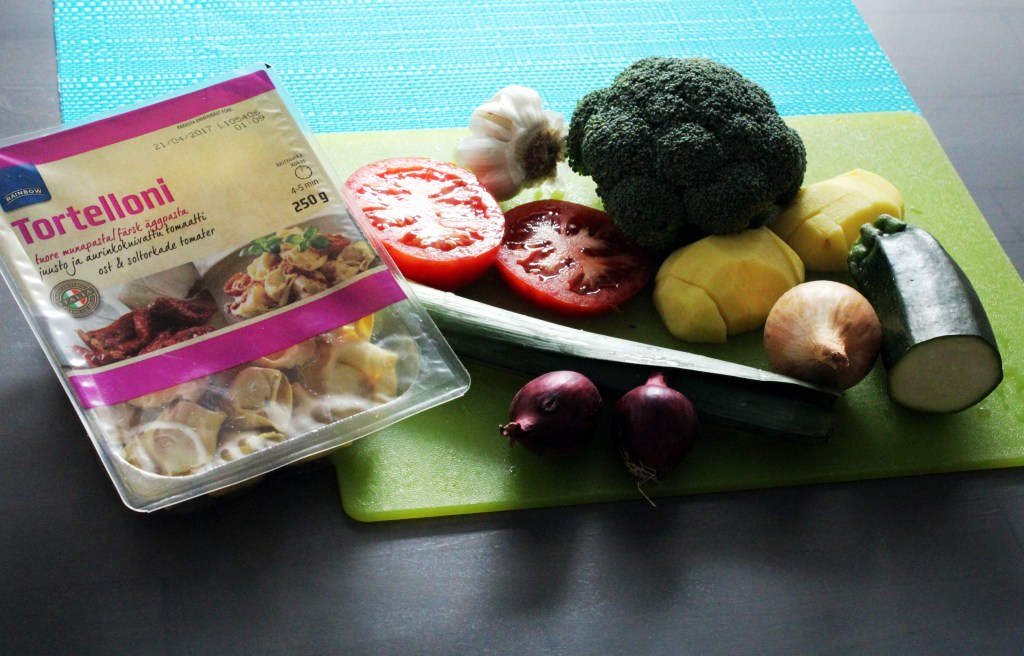 Kasvispataa tietenkin. Käytin lisänä kelta- ja valkosipuleita, chili-valkosipulikastiketta sekä yrttisuolaa. Jääkaapista löytyi myös paketti Otso-pojan lempimakarooneja. Juusto-tomaattitäytteiset tortellonit sopivat hyvin kasvisten kanssa. Lisäsin parsakaalin nuput aivan viime vaiheessa pataan. Niin ne jäivät mukavan rouskuviksi.