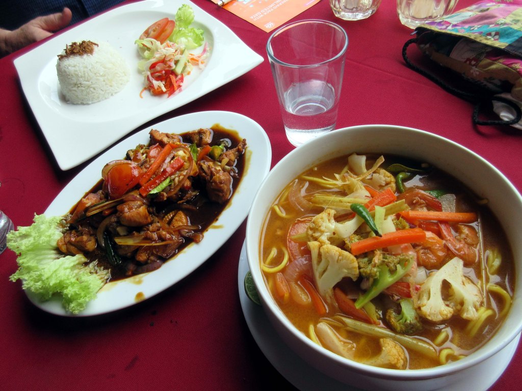 Buffet-illallinen oli ylellinen. Runsas salaattipöytä ilahdutti jokapäiväisen riisin ja nuudelin syönnin jälkeen. Toki niitäkin oli tarjolla samoin kuin kalaa kookosmaidossa, mustekaloja chilin kera ja pieniä maukkaita katkarapuja. Lihaa ja kanaa tietysti myös. Tuntuu että kana on täällä kansallisruoka. Jälkiruuaksi oli pieniä kakkupaloja ja neonvärisiä tutisevia hyytelöitä sekä tuoreita hedelmiä. Ruokajuomana nautimme kirkkaanpunaista hibiscusmehua juhlallisesti jalallisista laseista. Hyvää ja makeaa oli. Huomenna tuskin saamme silliaamiaista, mutta buffetaamiaisen kuitenkin. Se kuuluu mukavasti huoneen hintaan.