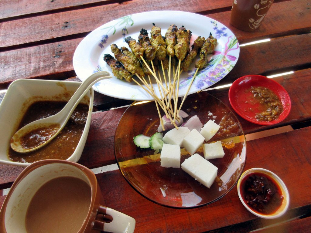 Lähdimme iltapäivällä katsastamaan paikallisia ruokapaikkoja pääkadun varrella. Istahdimme Satay -ravintolaan, joka tarjosi nimensä mukaisesti vain grillattuja kanavartaita. Minä olen opetellut matkan varrella syömään kalan ja kasvisten lisäksi myös kanaa, joten kelpuutin paikan. Grilliruoka oli maistuvaista sambal-kastikkeen ja kummallisten riisipalojen kera.