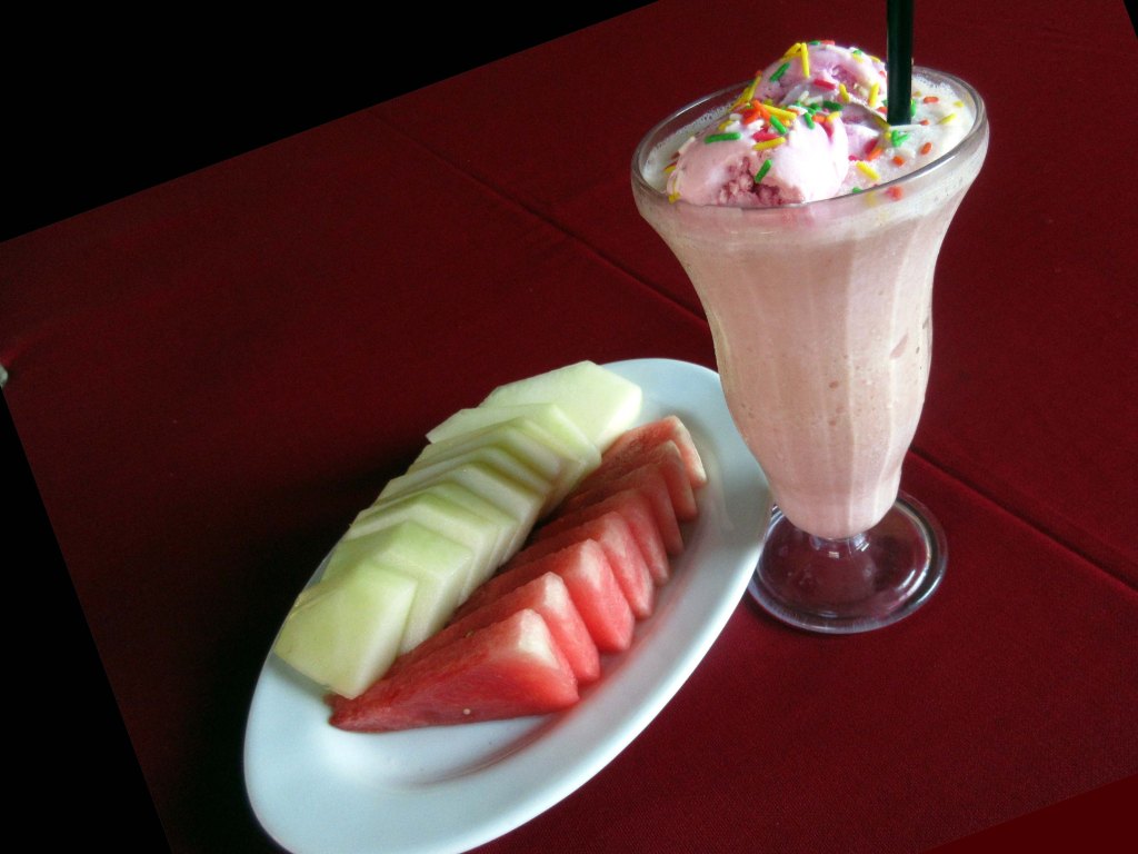 Jälkiruuaksi herkuttelimme omassa hotellissa hedelmillä ja mansikkapirtelöllä.