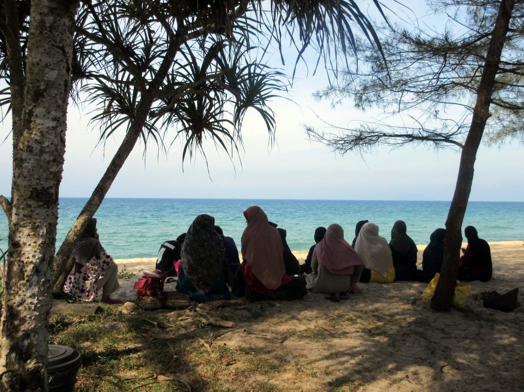 Ulkona minua kohtosi näky kuin elokuvasta. Hotellimme oli täyteen buukattu ja se näkyi. Puutarhassa oli vilskettä. Kymmenet muslimiperheet olivat aamiaisella. Riisikattilat höyrysivät, lapset juoksentelivat, nuoret miehet lepäilivät riippumatoissa ja kikattavat tytöt ottivat selfieitä.