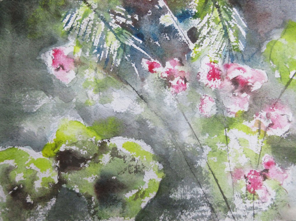 Minä maalasin aamiaisen jälkeen omalla verannalla, sillä mallikukka oli sopivasti silmieni edessä-