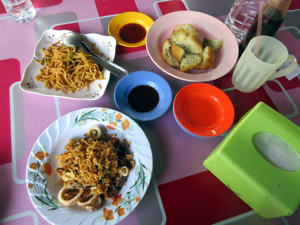Ensimmäiset ruoka-annokset illalla sitä vastoin eivät olleet. Mee goreng, paistetut nuudelit olivat hyvin maustettuja, mutta annos oli lähes kylmä. Ikan goreng, paistettu kala oli rutikuivaa. Sotong goreng, paistettu mustekala oli loppu. Eivät annokset tosin paljon maksaneetkaan.
