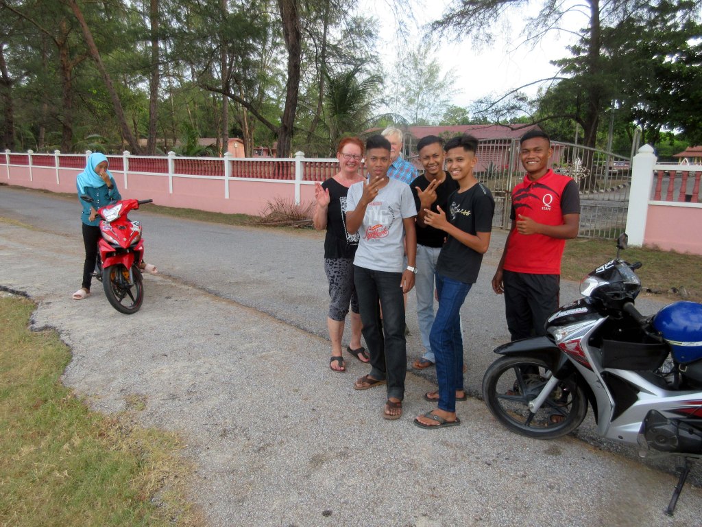 Paluumatkalla iloinen poikajoukko piiriti meidät ja halusi ottaa valokuvia.  Kaikki vastaantulijat hymyilevät, huivipäiset tytöt vilkuttavat mopon kyydissä ja pikkulapset töllistelevät.  Taidamme olla paikkakunnan nähtävyys.