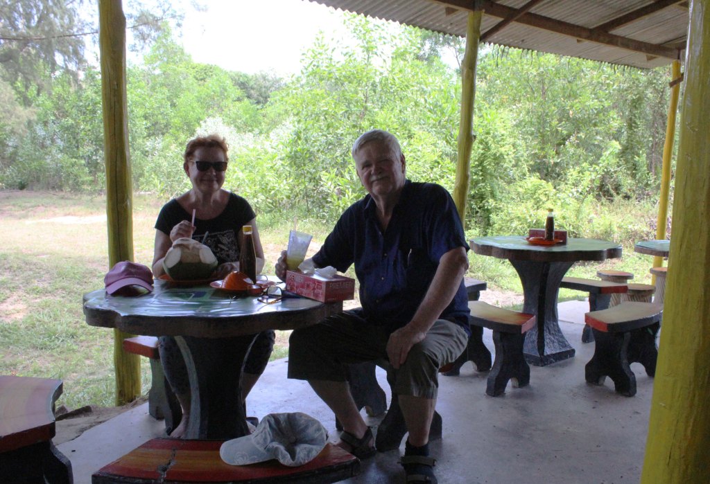 Meri välkehti aamulla peilityynenä.  Keinuimme mainingeilla pitkän tovin ja nautimme lämpimästä vedestä.  Oli miltei puolipäivä, kun ehdimme aamiaiselle.  Nyt lähikuppilamme oli auki.  Se tarjosi meille vaihteeksi nuudeleita.  Saimme paistettuja nuudeleita soijakastikkeella (tällä kerralla kuumia) ja nuudelikeittoa kanan kera (polttavan kuumaa).  Juomina teetä kondensoidun maidon kera ja jakung-mehua.  Google kääntäjä tiesi, että jakung on maissia.  Mielenkiintoista.