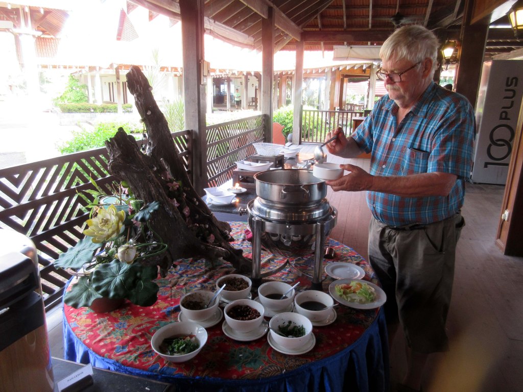 Lomamatkamme Malesian itärannikolla on kestänyt jo kaksi viikkoa. Alamme pikku hiljaa oppia paikallisten ruokien nimiä. Kiitos google-kääntäjän, meille selviää ainakin jälkikäteen mitä olemme nauttineet. Hotelleissa on yleensä tarjolla sekä länsimainen että maleaamiainen. Olemme kokeilleet tasapuolisesti molempia. Paistettuja nuudeleita, mee goreng soijakastikkeessa – paikallisella kielellä kicap – ja paistettua riisiä, nasi goreng saa lähes joka paikassa. Lisukkeiden nimet ovatkin sitten asia erikseen. Ayam on kana, ikan kala, datang liha, sotong mustekala, sayur-sayuran kasvikset, telur kananmuna.