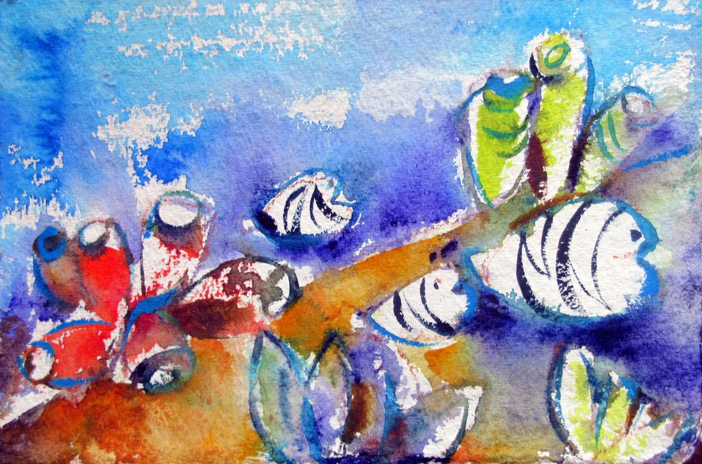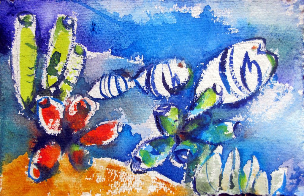 Merikuvat syntyivät Kuala Terengganussa näkemieni seinämaalausten innoittamina. Jätimme tällä matkalla saaret ja snorklauksen väliin. Mutta ainahan voi kuvitella miltä merenpohjassa näyttää.